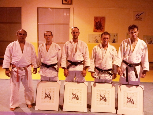 26 septembre 2013 - Les quatre nouveaux 4ieme DAN (Frédéric Maniglier, Philippe Poenset, Mickaël Borel et Lionel Valet) récompensés par le club. Ils recoivent une gravure A. Bar.